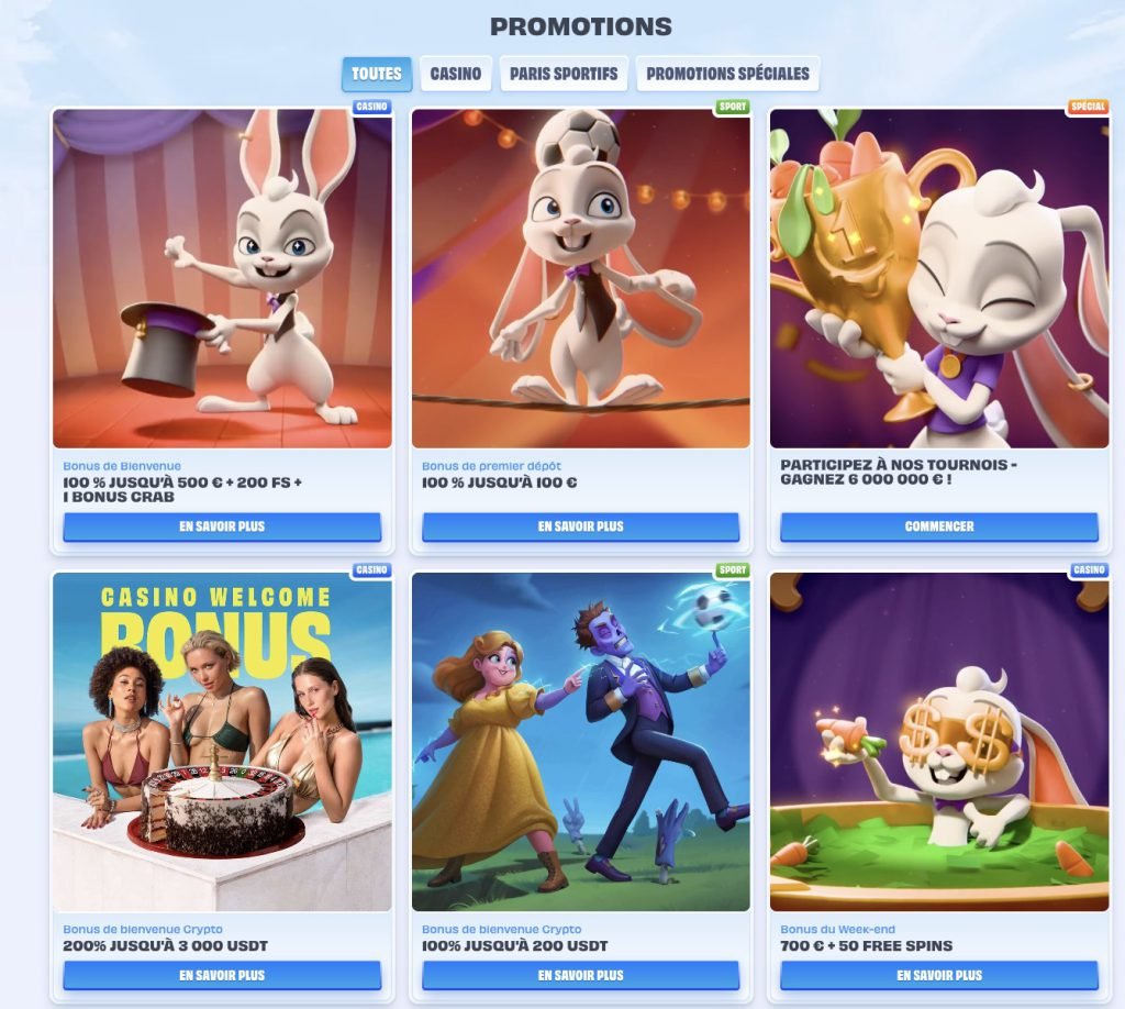 Le bonus de bienvenue casino offre 100% jusqu’à 500€, accompagné de 200 Free Spins et d’un Bonus Crab. Les amateurs de cryptomonnaies bénéficient d’une offre encore plus généreuse avec 200% jusqu’à 3 000 USDT. Du côté des paris sportifs, le premier dépôt est doublé à hauteur de 100€, ou 200 USDT pour les transactions crypto.
